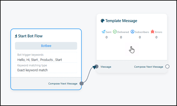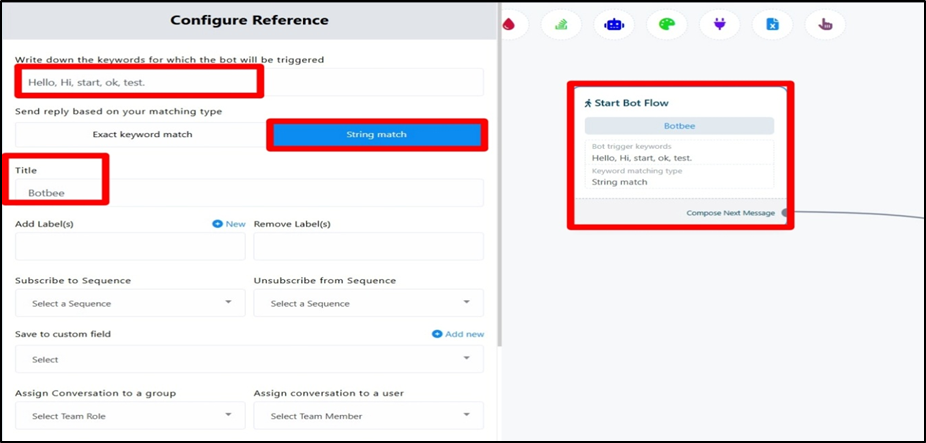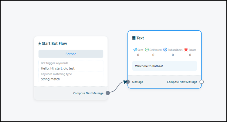 - Click on “Start Bot Flow” and Add keywords such as “hello”, “hi”, or “hey”.