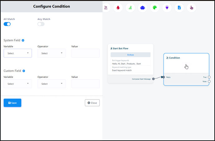- The Condition element is used to create logic-based chatbot flows.