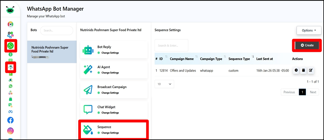 - Go to Bot Manager and click on Sequence then Create.