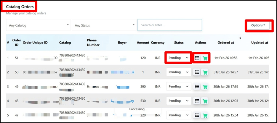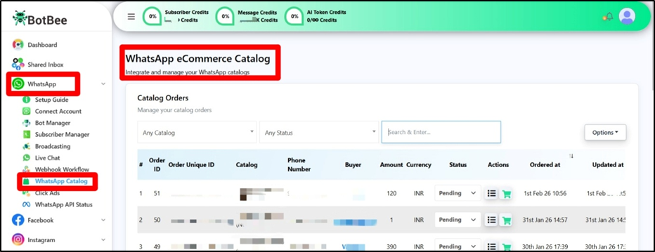- The Catalog Orders section displays all customers who have placed orders through the WhatsApp catalog.