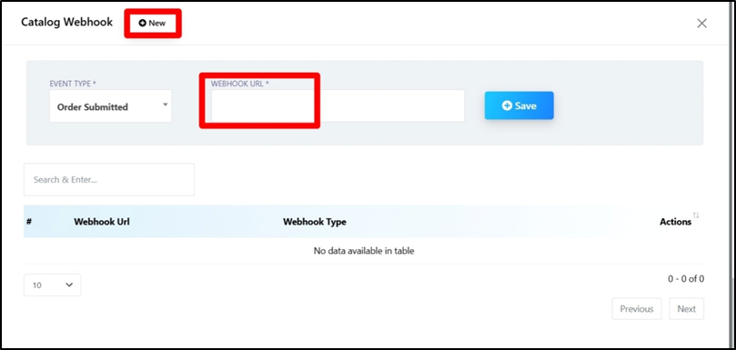 - Clicking on the Webhook button allows you to create a catalog webhook.