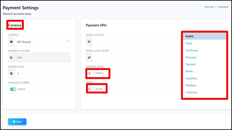 - Configure online payment gateways such as PayPal, Razorpay, Stripe, etc.