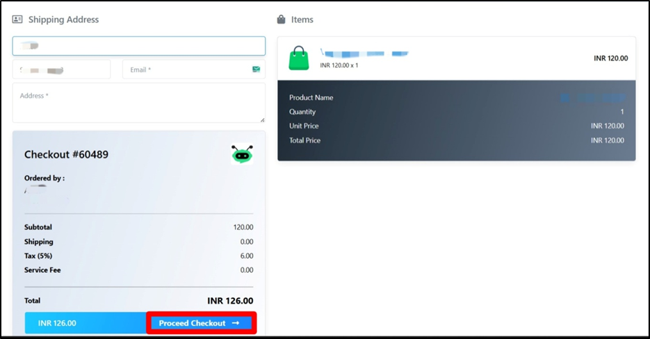- Click Proceed Checkout to confirm the order and continue with payment (if enabled).