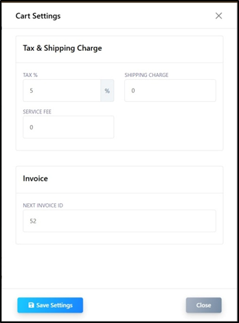 - Set the Tax (%), Shipping Charge, and Service Fee for catalog orders.