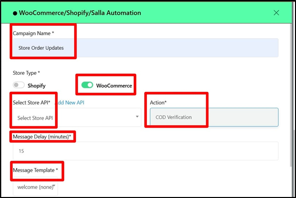 - Store Type & API: Select the platform you connected earlier (WooCommerce or Shopify) and choose the corresponding API.