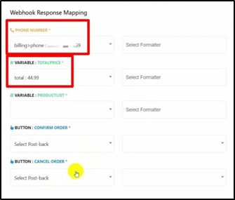 - After configuring the WooCommerce webhook and placing a test order, the next step is Webhook Response Mapping. This step ensures that the data received from WooCommerce is correctly connected to the variables used in your WhatsApp message template.