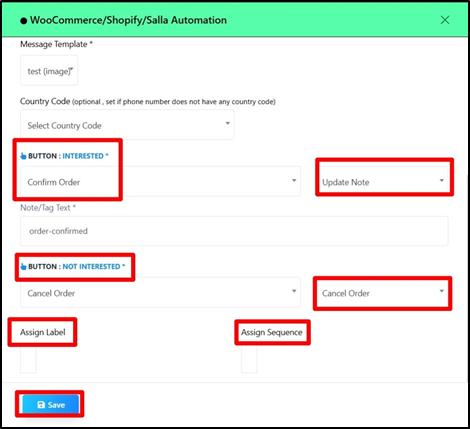 - Update Note: Select this option for the Confirm Order button to automatically add a note to the order when the customer confirms it on WhatsApp.
