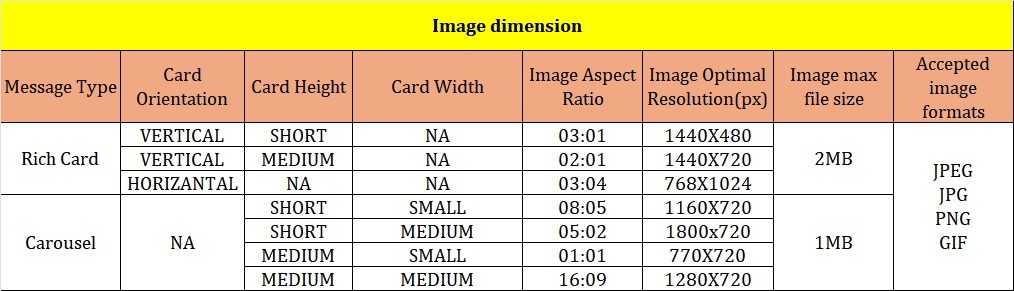 Follow the recommended image sizes for Rich Cards and Carousel messages to ensure correct display and faster RCS approval.