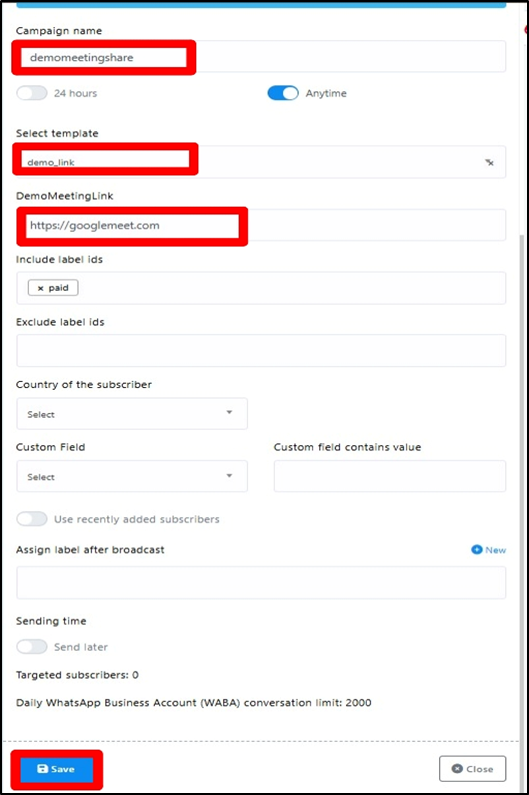 - Sending Time: You can Schedule this campaign for some other time by selecting correct and choosing the time. Or you can just send it right away.