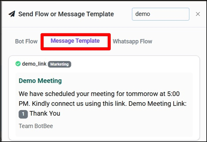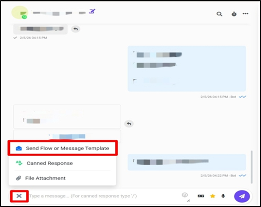 - Click on the plus icon and select “Send Flow or Message Template”.