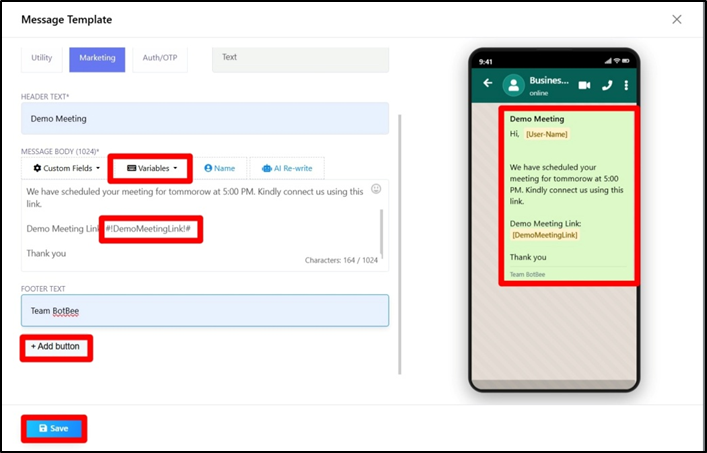 - Marketing: Used for promotional or engagement messages. It can include text, images, videos, and documents.