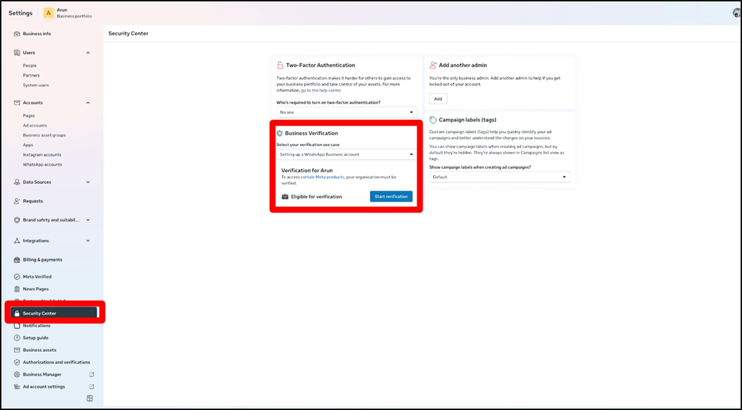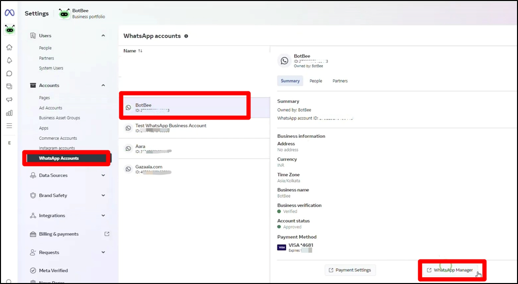 - Go to business settings and then select WhatsApp account.