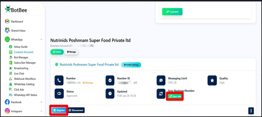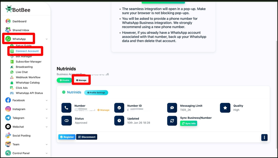 - Go to your BotBee dashboard and Click on Connect Account under WhatsApp.