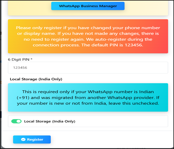 - After entering the PIN , there is an option of “Local Storage (India Only)”, Enable it only when your WhatsApp number is Indian (+91) and was migrated from another WhatsApp provider. If your number is new or not from India, leave this unchecked.