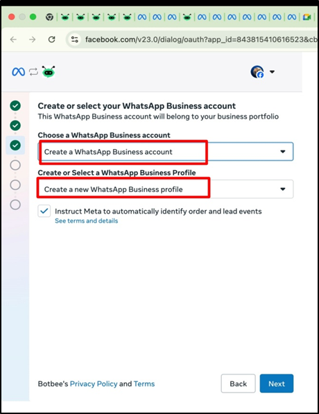 - Select "Create a New WhatsApp Business Account" from the above dropdown and Select “Create a new WhatsApp Business Profile” from the second dropdown menu and click on Next.